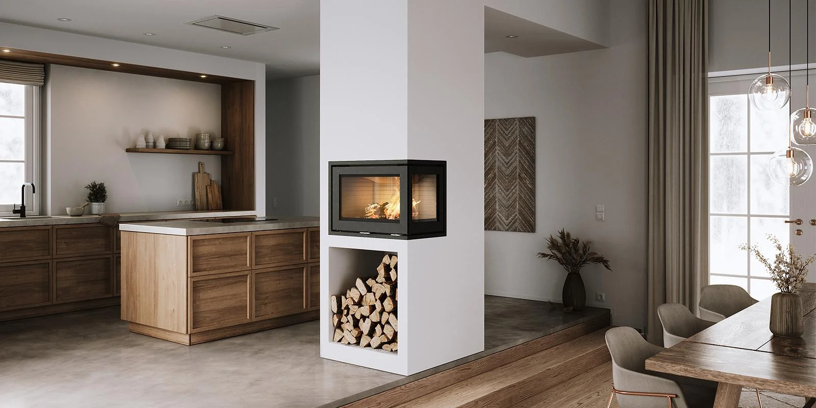 Udgaven med glas på to sider skaber et markant ildhjørne, hvor du selv vælger, om sideglasset placeres til højre eller venstre. Den slanke indsats går naturligt i ét med den moderne indretning.