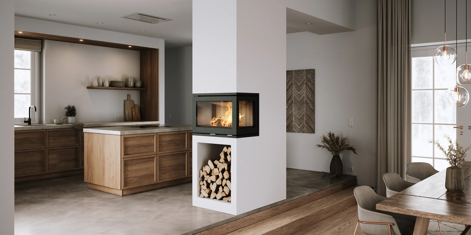 RAIS 500-3 med glas på tre sider giver en særlig identitet til indretningen. De store glasflader åbner for rigt indsyn til flammerne, så ovnen naturligt bliver hjemmets samlingspunkt.